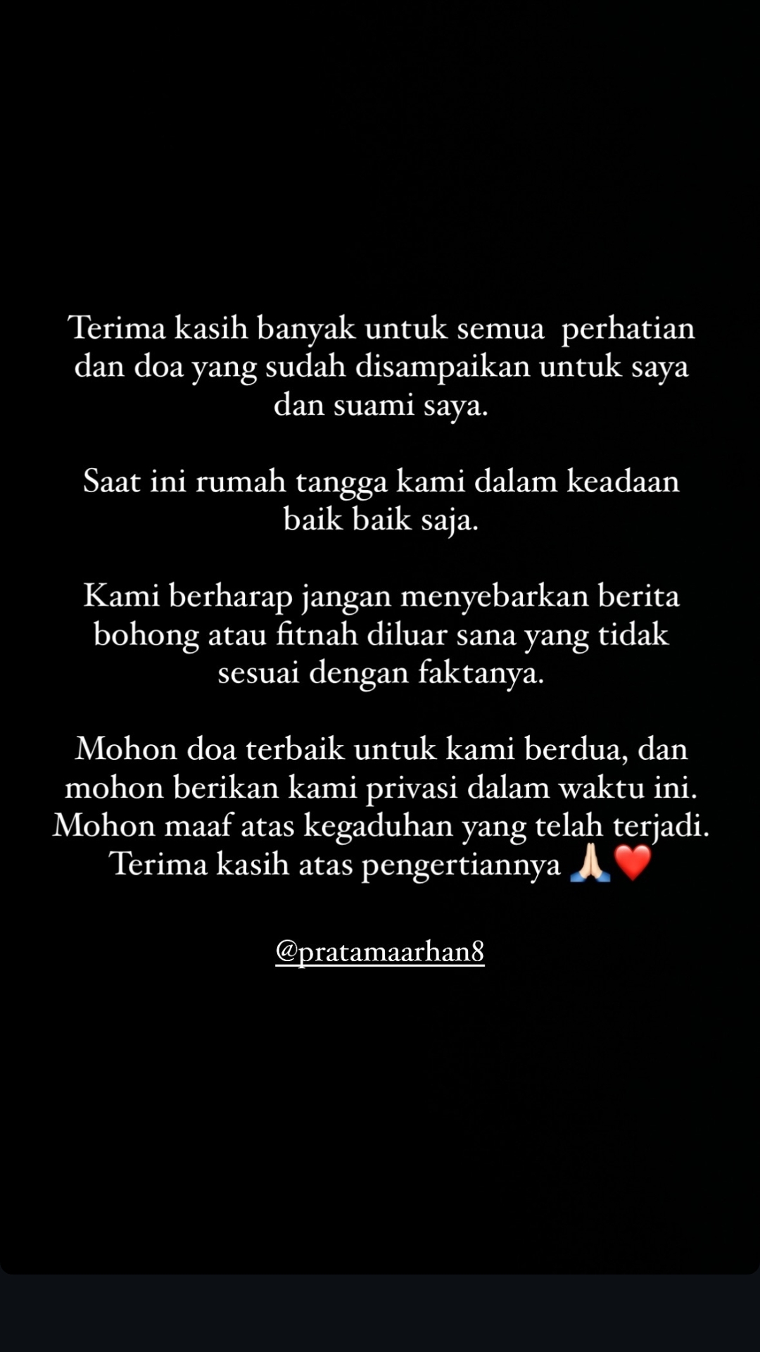 “Saat ini rumah tangga kami dalam keadaan baik-baik saja,” lanjutnya, menekankan bahwa kabar yang beredar di media sosial tidaklah benar.