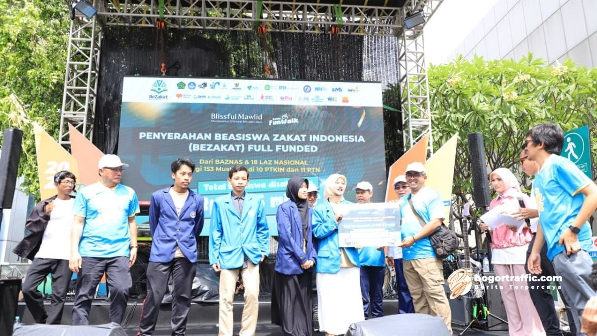 bogortraffic.com, BOGOR – Kementerian Agama (Kemenag) menyerahkan Beasiswa Zakat Indonesia senilai Rp16,85 miliar kepada 153 mahasiswa serta meresmikan 35 titik Kampung Zakat dalam rangkaian kegiatan ZaWa (Zakat Wakaf) Funwalk 2025 yang digelar Direktorat Jenderal Bimbingan Masyarakat Islam (Ditjen Bimas Islam) di Jakarta, Minggu (21/9/2025).