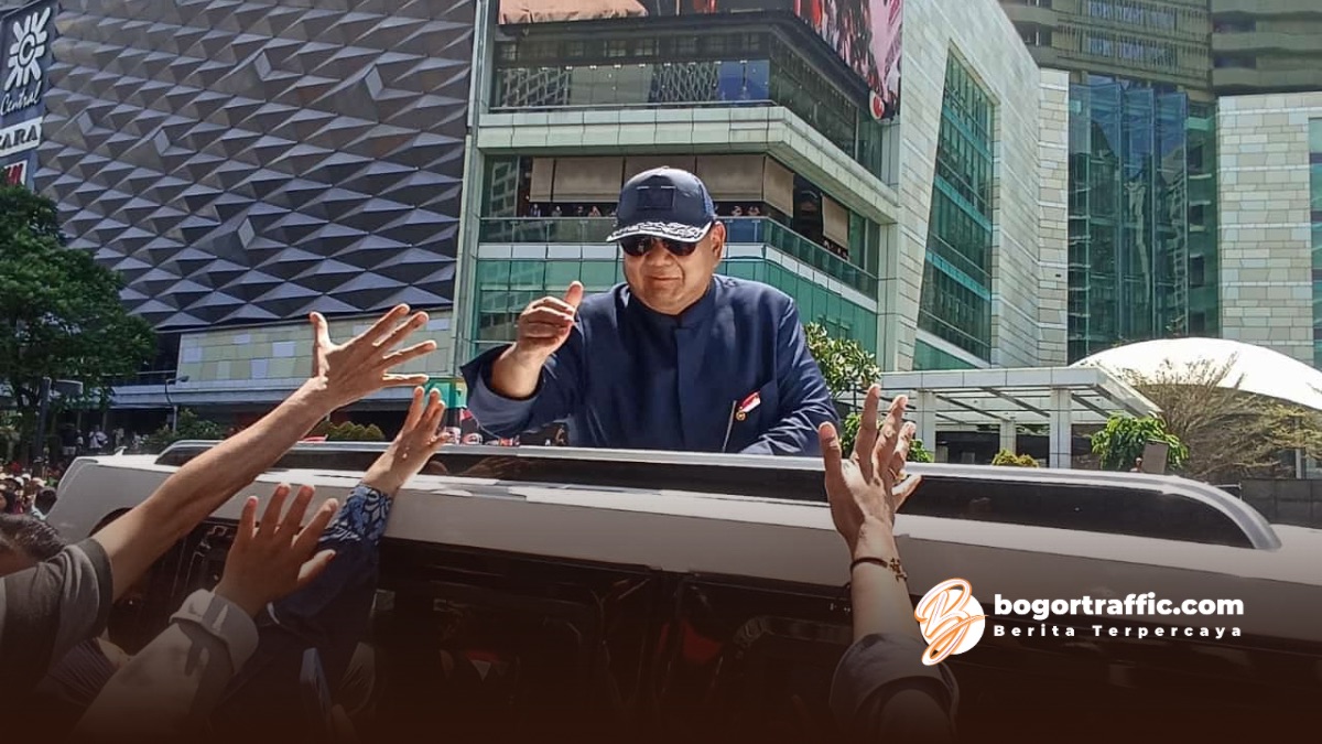 bogortraffic.com, JAKARTA – Presiden ke-8 Republik Indonesia, Prabowo Subianto, menyapa langsung masyarakat yang memadati Bundaran Hotel Indonesia (HI) dalam rangka menyambutnya pada Minggu (20/10/2024). Prabowo berdiri dari atap mobil yang membawanya, mengenakan topi biru dongker dan kacamata hitam, sambil melambaikan tangan ke arah warga yang telah menantinya.