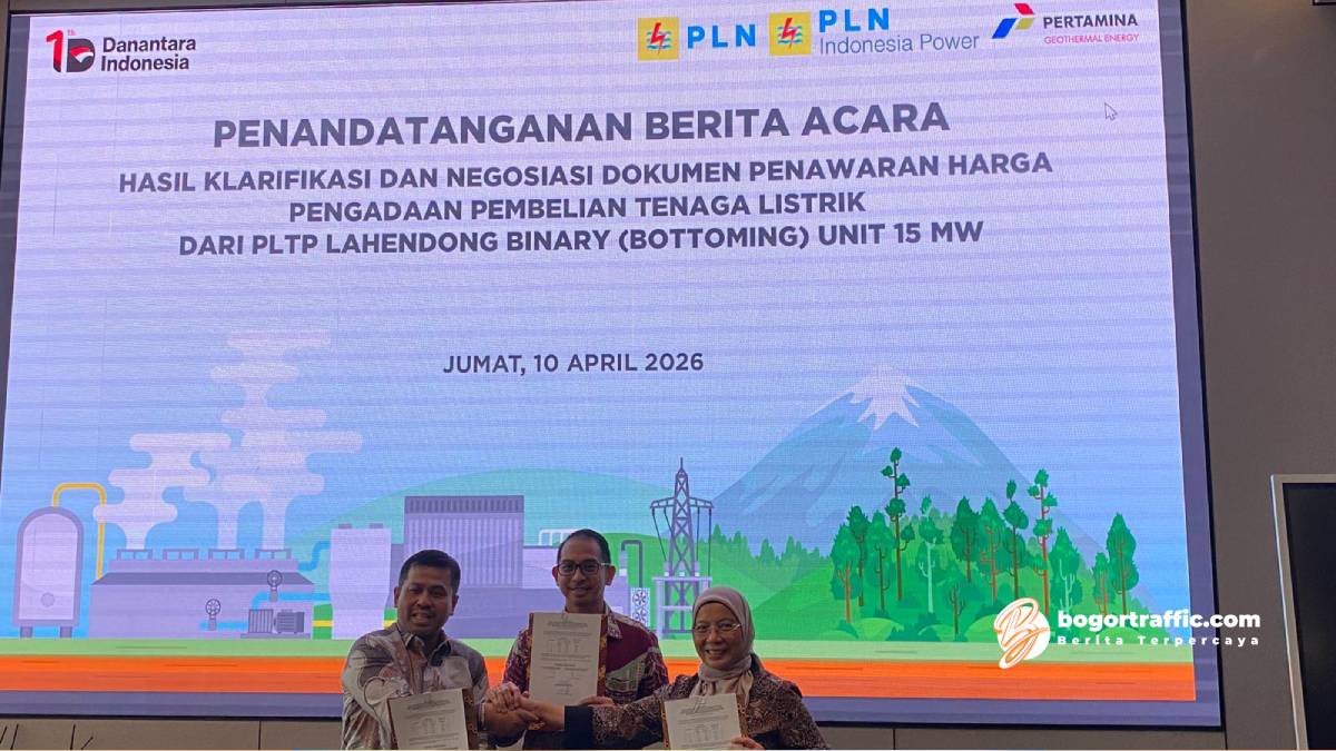 bogortraffic.com, BANDUNG — Konsorsium PT Pertamina Geothermal Energy Tbk (PGE) (IDX: PGEO) dan PT PLN Indonesia Power (PLN IP) mencapai kesepakatan tarif listrik dengan PT PLN (Persero) untuk pengembangan proyek Pembangkit Listrik Tenaga Panas Bumi (PLTP) Lahendong Bottoming Unit berkapasitas 15 megawatt (MW).