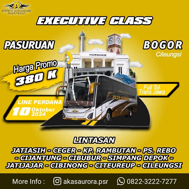 Bagi yang berminat mencoba rute baru ini, tiket dapat diperoleh melalui agen resmi PO Akas Aurora. Rute Bogor-Pasuruan ini diharapkan dapat menjadi solusi transportasi yang nyaman dan terjangkau bagi para penumpang yang ingin bepergian dengan fasilitas eksekutif.