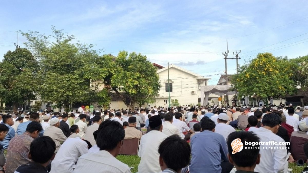 bogortraffic.com, BOGOR – Ribuan jamaah yang memenuhi Ruang Terbuka Hijau (RTH) Taman Pagelaran, Ciomas, Bogor, khusyuk mendengarkan khutbah Idulfitri 1446 H yang disampaikan oleh H. Abdul Aziz Siswanto, S.Th.I, Senin (31/3) pagi.